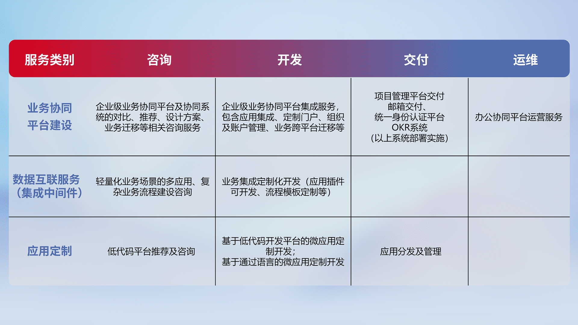 针对钉钉、、、、企微、、、IDaas等平台级产品提供产品的规划、、、、方案、、、交付、、、、定制化开发等服务,,,实现如统一协同办公、、、、智能客户服务、、、、混合会议管理、、智能数据查询、、、等业务场景,,,,实现数字化转型。。。